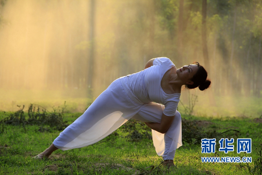 6月19日,瑜伽愛好者在內(nèi)黃縣萬畝槐林內(nèi)練習(xí)瑜伽。夏至?xí)r節(jié),河南省內(nèi)黃縣瑜伽愛好者走進(jìn)槐林深處,在樹蔭下舒展身心,靜享清涼。