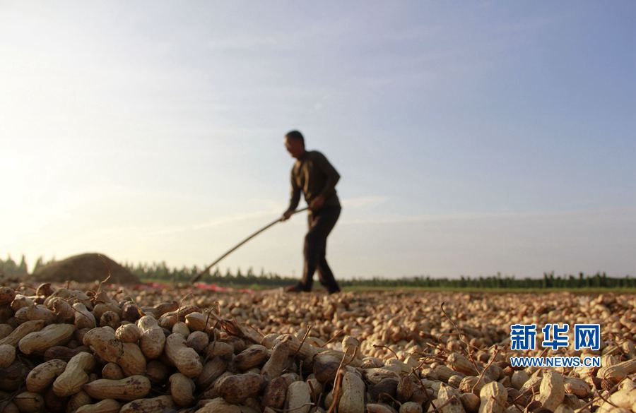 8月26日,河南省內(nèi)黃縣城關(guān)鎮(zhèn)丁莊村的農(nóng)民在晾曬花生。