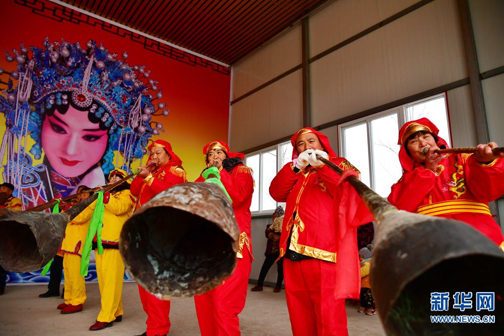 2月7日,村民在羅閣村文化舞臺表演羅閣大喇叭。 當(dāng)日,河南省駐馬店市西平縣盆堯鎮(zhèn)羅閣村的文化舞臺熱鬧非凡,村民表演了舞獅、豬八戒背媳婦、抬轎子、劃旱船、騎竹馬、吹喇叭等民俗節(jié)目,吸引眾多村民前來觀看。新華社記者馮大鵬攝 -