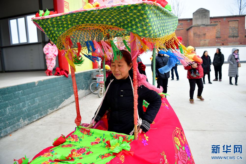 2月7日,村民在羅閣村文化舞臺表演劃旱船。 當(dāng)日,河南省駐馬店市西平縣盆堯鎮(zhèn)羅閣村的文化舞臺熱鬧非凡,村民表演了舞獅、豬八戒背媳婦、抬轎子、劃旱船、騎竹馬、吹喇叭等民俗節(jié)目,吸引眾多村民前來觀看。新華社記者馮大鵬攝 -