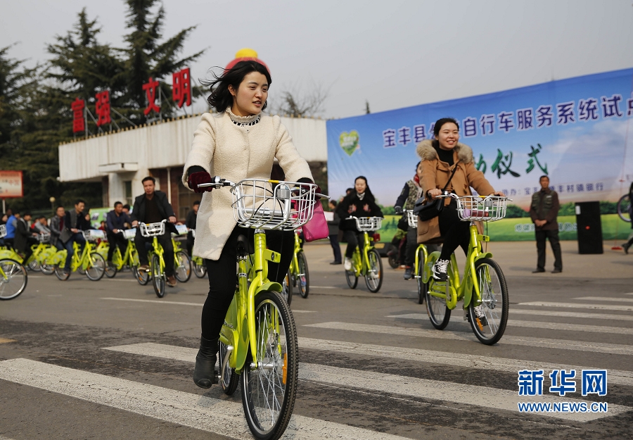 •    3月6日,在河南省寶豐縣,居民體驗剛投入使用的公共自行車。當日,河南省寶豐縣啟動公共自行車服務系統,首批共設置35個公共自行車租賃點,投放自行車近1000輛。居民可憑身份證辦理租車卡或直接使用支付寶、手機客戶端在租賃點取還車。據了解,寶豐縣公共自行車服務系統采用政府主導、企業出資、市場運作的模式實施。站點主要集中在縣城人流密集場所,以方便居民綠色出行。新華社發(何五昌 攝)