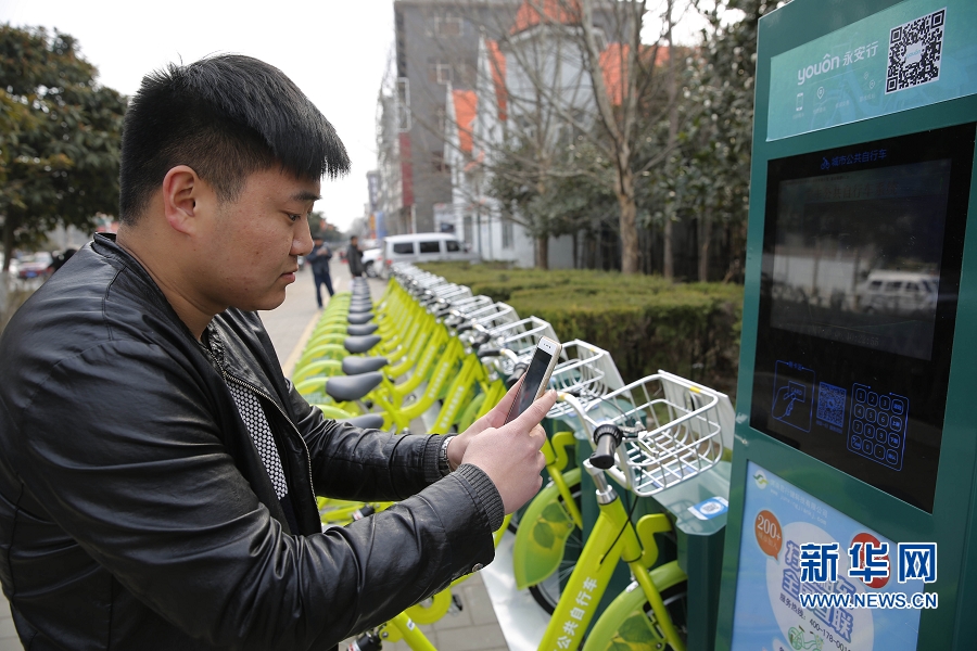 •    3月6日,在河南省寶豐縣,居民在一個租賃點使用手機掃碼借用公共自行車。