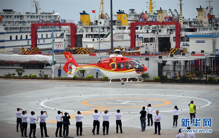 4月28日,直升飛機從?谛潞8鄞a頭起飛。當日,北京首航直升機股份有限公司聯合海南港航控股股份有限公司在?谛潞8叟e行瓊州海峽直升機擺渡飛行開航儀式。首航直升機運營的空客H135型直升機,從海南省海口新海港碼頭起飛,飛往廣東省湛江市徐聞海安港,空中飛行時間僅需10分鐘,比傳統輪渡快了2個多小時,單人票價為898元。新華社記者郭程攝