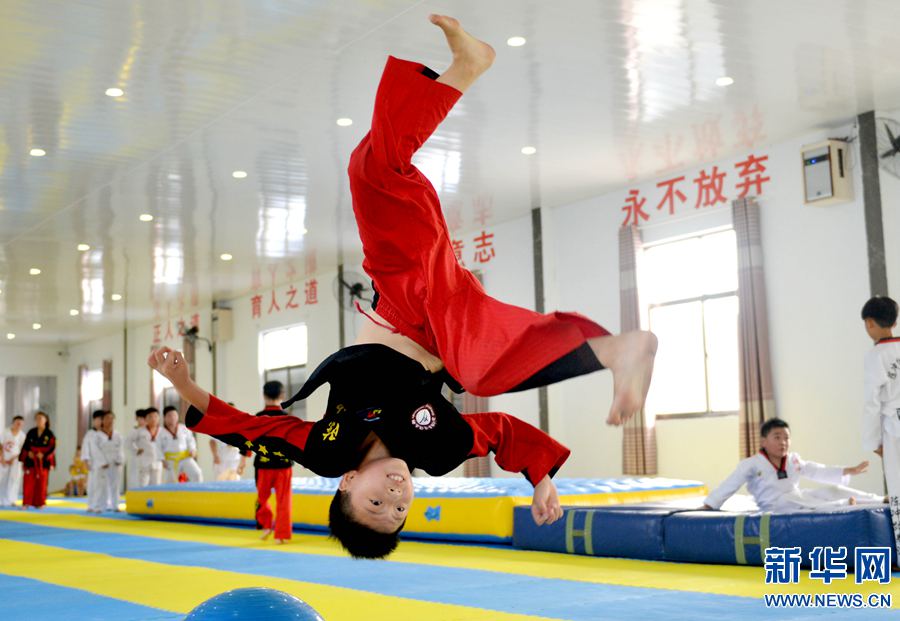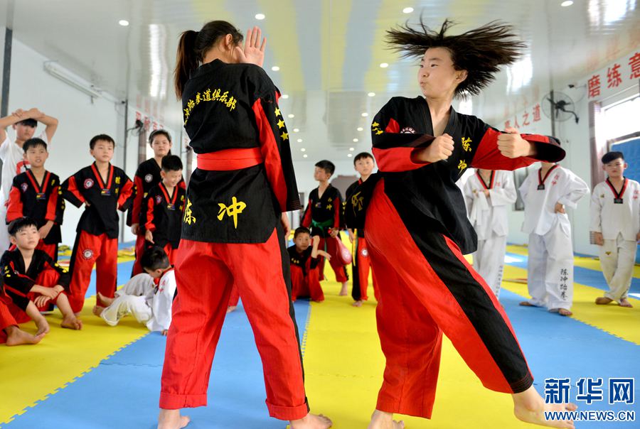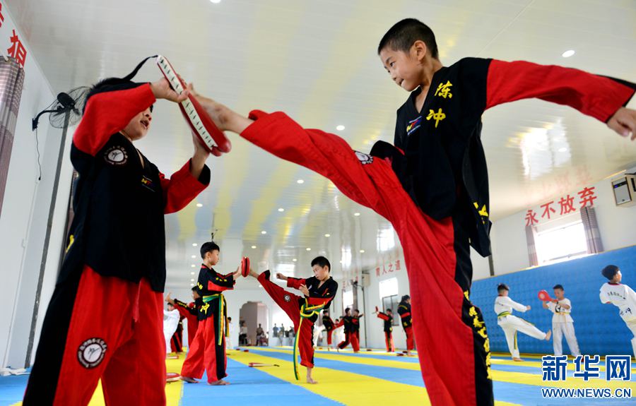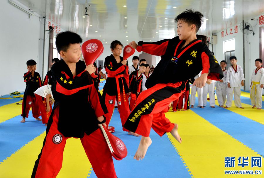 • 7月4日,少年兒童在河南省夏邑縣跆拳道訓練館練習跆拳道動作。暑假伊始,河南省商丘市夏邑縣的許多家長把孩子送到當地武術、跆拳道場館學習武術和跆拳道基本功,以此釋放青少年享玩天性,讓孩子們樂享暑假。新華網發(苗育才 攝)