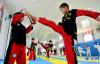 • 7月4日,少年兒童在河南省夏邑縣跆拳道訓練館練習跆拳道動作。