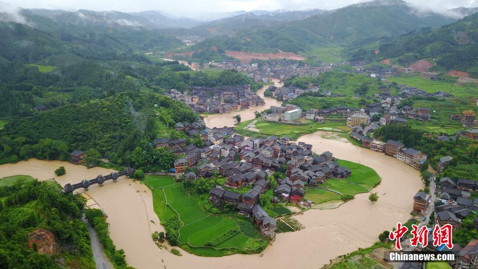 7月10日,廣西柳州市三江侗族自治縣遭受強(qiáng)降雨襲擊,該縣城程陽八寨景區(qū)內(nèi)河流水位上漲,程陽風(fēng)雨橋被洪水圍困。該景區(qū)因?yàn)?zāi)封閉,已緊急疏散滯留在景區(qū)內(nèi)的全部游客。建于1912年的程陽風(fēng)雨橋是世界歷史名橋,也是中國迄今保存較完整、規(guī)模較大的侗寨風(fēng)雨橋。圖為無人機(jī)航拍被洪水圍困的三江侗族自治縣程陽風(fēng)雨橋。龔普康 攝 -