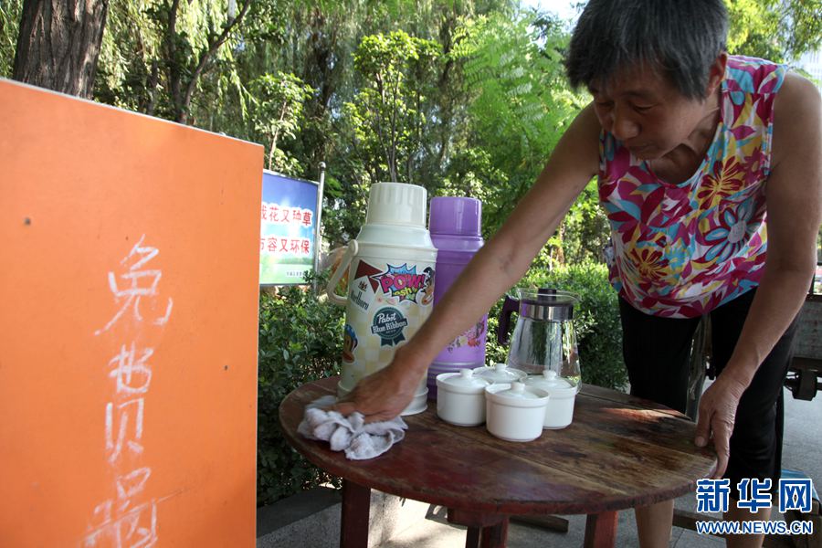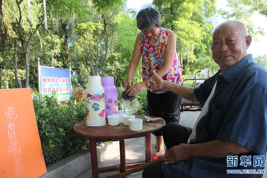 到“免費(fèi)茶攤”喝水的有附近的環(huán)衛(wèi)工,有路過的民工,也有普通市民。“只要身體允許,我以后每年伏天都免費(fèi)為路人提供茶水。”段守蘭堅(jiān)定地說。新華網(wǎng)發(fā)(牛書培 攝) -