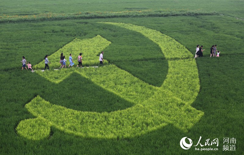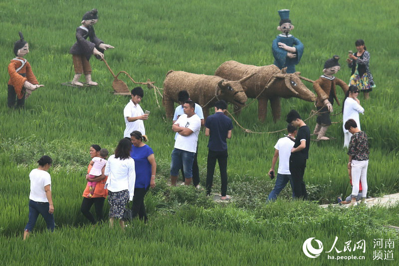 •    7月30日,駐馬店確山縣留莊鎮稻田文化藝術公園里,人流如織,摩肩接踵,來自四面八方的游客爭相領略留莊稻田畫的魅力。