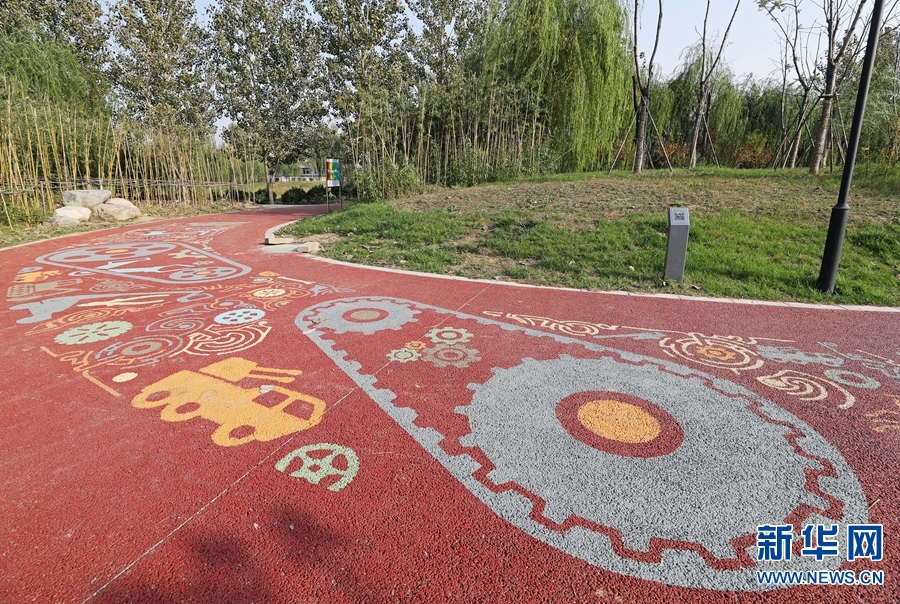 西吳河公園占地面積約為166畝,始建于2015年,外圍的一條環(huán)形跑道,長度為1036米。2017年,為了普及科學(xué)知識,提升全民科學(xué)素質(zhì),鄭州市管城回族區(qū)科學(xué)技術(shù)協(xié)會和鄭州市雕塑壁畫院在環(huán)形跑道上設(shè)計并制作了從侏羅紀(jì)時代到新千年的科普畫卷,畫卷共分9個主題,分別為生命歷程、綠色交響、水上樂章、風(fēng)馳電掣、天際翱翔、恐龍時代、傳動之歌、星空燦爛和科技無限。每一個主題長度為100米,其旁邊豎立有該主題的二維碼,用手機掃描則可以看到這一主題的電子版詳情介紹。新華網(wǎng) 王威 攝 -