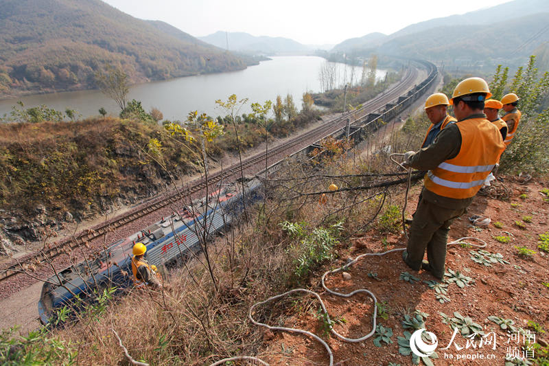 11月17日,河南省南陽工務(wù)段平頂山西橋梁車間職工,一路披荊斬棘,沿著陡峭山坡爬到山頂,對臨近鐵路線兩側(cè)的山體進(jìn)行雜樹砍伐、危石清除和安裝主動(dòng)防護(hù)網(wǎng)作業(yè)。 -