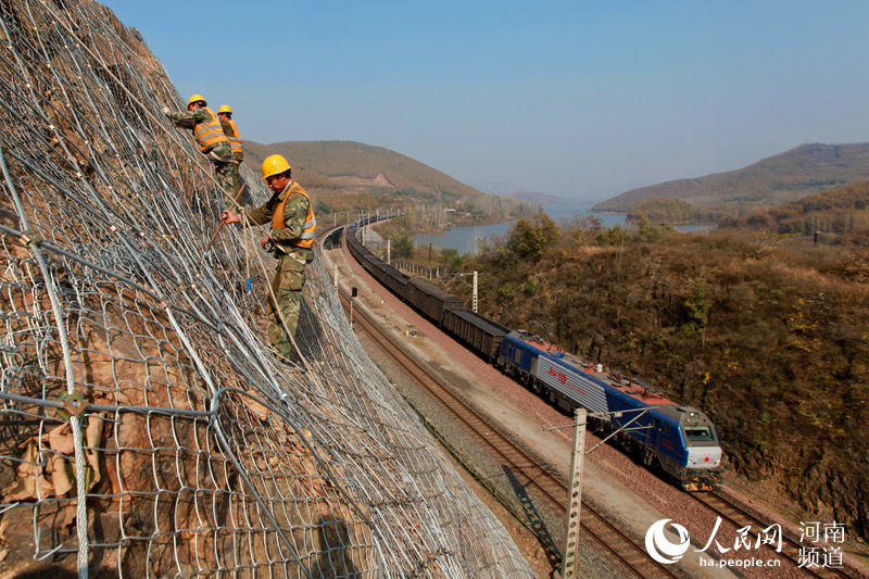峭壁上“行走”。鐵路兩側(cè)受地形地貌、巖石屬性等復(fù)雜條件的限制和制約,每逢雨雪天氣,時(shí)有石塊從山上掉落,山體滑坡、塌方等危險(xiǎn)情況隨時(shí)可能發(fā)生,嚴(yán)重威脅線路設(shè)備和行車的安全。為排除隱患,該段成立山體加固施工隊(duì),根據(jù)之前調(diào)查的整治任務(wù),按照整治方案對山體進(jìn)行加固防護(hù)。(霍亞平) -