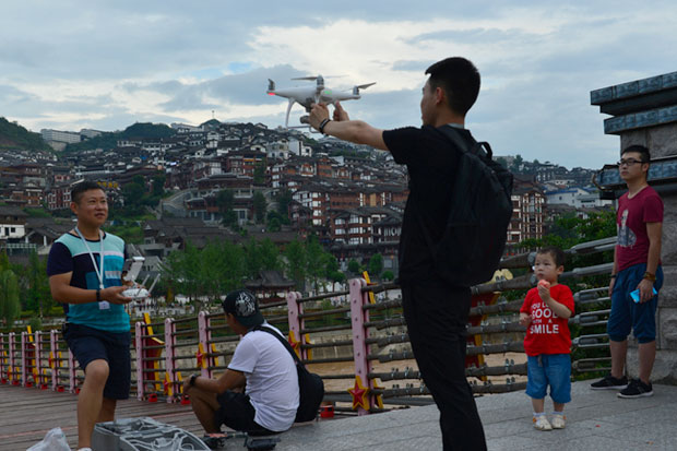此次報名參加“空中瞰茅臺”活動的,不僅有從四面八方趕來的貴州旅游在線的忠實攝友,還有十余位貴州領空俱樂部的大疆無人機攝影師。在1915廣場上,這些新鮮玩意兒吸引來了大量市民與外地游客圍觀。“這個飛機真酷!是拿來拍照的吧?”市民余劉先生忍不住好奇詢問,得知可以用來拍照和視頻更是不斷感慨,“現在的科技越來越發達了,拍照都能飛到天上拍咯!”