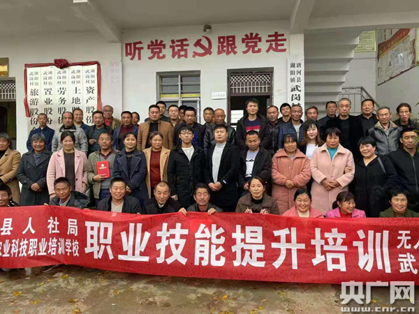 央廣網(wǎng)南陽11月19日消息(記者 彭華 通訊員 陳炳謙)為進一步提升和增強貧困戶(脫貧戶)群眾就業(yè)能力、創(chuàng)業(yè)本領,拓展增收致富渠道,夯實就業(yè)扶貧基礎,確保貧困戶持續(xù)增收穩(wěn)脫貧。11月13日,唐河縣湖陽鎮(zhèn)在武崗村農(nóng)民學校舉辦植保無人機飛行駕駛技術首期培訓班,武崗村貧困戶(脫貧戶)中有勞動能力人員及新型農(nóng)村合作社、種糧大戶等共計60余人參加培訓。培訓班由唐河縣人社局牽頭承辦,湖陽鎮(zhèn)扶貧辦組織實施,唐河縣湯紅農(nóng)業(yè)科技職業(yè)技術學校老師為參訓學員授課。