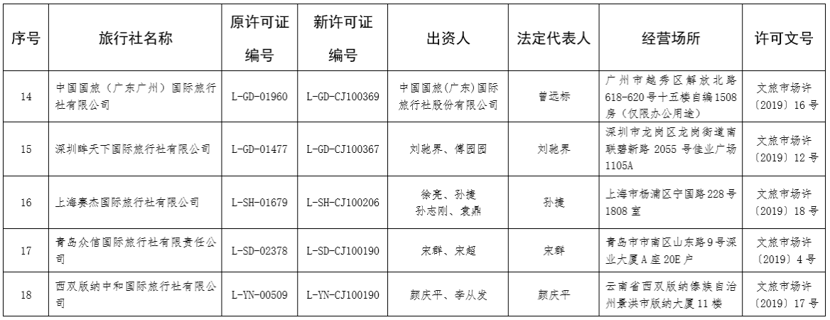 央廣網(wǎng)北京5月28日消息(記者梁晨) 5月27日,文化和旅游部發(fā)布《關(guān)于許可旅行社經(jīng)營出境游業(yè)務(wù)的公告》。公告顯示,按照《旅行社條例》和《中國公民出國旅游管理辦法》,許可以下18家旅行社經(jīng)營出境游業(yè)務(wù):