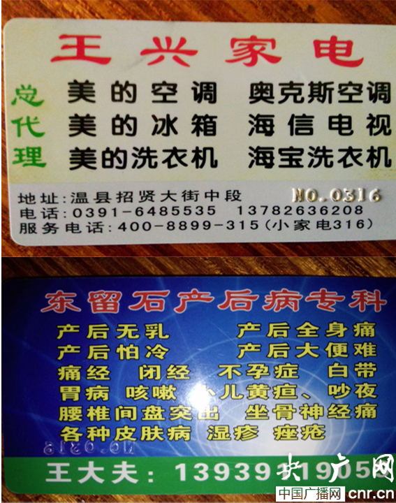 在招賢鄉大街,有一家“美的電器”超市,專營各式家電,店老板還廣發名片,招攬顧客。記者看到此廣告名片正面印有王興家電總代理,銷售各類家電等字樣。讓人吃驚的是,名片背面卻是“東留石產后病?啤,超市老板“王大夫”主治“產后無乳”、“產后全身痛”、“產后怕冷”、“不孕癥”等婦科疾病,還能治“胃病”、“腰椎間盤突出”以及“各種皮膚病”。