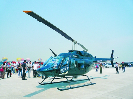在通往開幕式的必經道路上,該公司部署了一架美國貝爾大型直升機供來往游人觀看、留影。據該公司的負責人朱明明介紹,這種直升機的最低價格2000多萬元人民幣,這一架是該公司購買的第一架直升機。隨后他們還將購買13架價位不等的貝爾直升機和4架型號不同的羅賓遜直升機落戶安陽,用于打造國內首家直升機4S店。