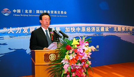 5月28日,“大力發展服務貿易 加快中原經濟區建設”主題推介會在北京隆重舉行。省長郭庚茂發表主題演講。記者 董亮 攝