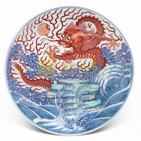 上海斗寶藝術展出青花斗彩海水龍紋盤