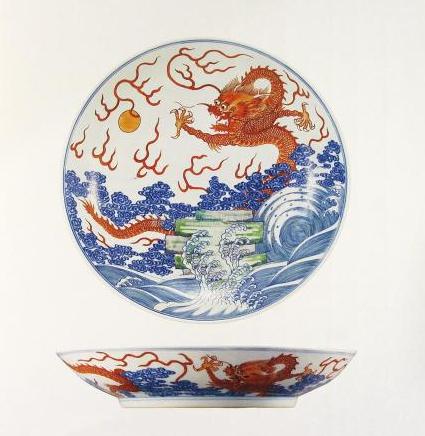 清朝斗彩瓷器的產量要大于明朝成化時期。康熙、雍正、乾隆官窯也有不少精品堪與成化斗彩媲美,而且出現了較大的器型。總的來看,清朝盛世的斗彩瓷器大多數繪畫精工,改變了成彩“葉無反側”、“四季單衣”的弱點,圖案性更強,但也失去了成彩清秀飄逸的風采。康、雍、乾官窯都有一些仿成化斗彩產品,已能有把握地仿燒出成化斗彩,但這些仿品大都署本朝年款或不落款,只有少數寄托成化款。對這些器物要從胎、釉、彩繪等幾個方面仔細辨別。清代仿制斗彩瓷器,是從康熙時期開始的。雖然康熙時的多數產品不及成化的精致,但當時的積極探索為以后燒制斗彩瓷器的成功奠定了基礎。而這件海水龍紋盤,無疑是康熙時期的青花斗彩瓷器中的精品。