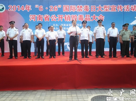 央廣網河南分網消息 (記者 李欽烽 通訊員 張波) 6月24日上午,由河南省禁毒委主辦、省公安廳承辦、鄭州市公安局協辦的“河南公開銷毀毒品大會”在鄭州新區藝術中心廣場隆重舉行。省政府副省長、省禁毒委主任李亞發表重要講話,省長助理、省禁毒委常務副主任、省公安廳廳長王小洪主持大會,省直有關部門負責同志,公安民警、武警和禁毒志愿者、社會各界群眾代表1000余人參加大會。
