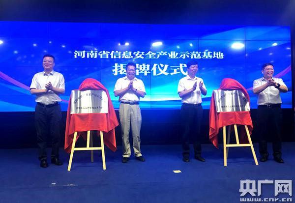 河南省工業和信息化委員會副主任朱鳴、鄭州市副市長史占勇、鄭州市工業和信息化委員會主任范建勛、金水區區長魏東為河南省信息安全產業示范基地、鄭州市信息安全產業示范基地揭牌。
