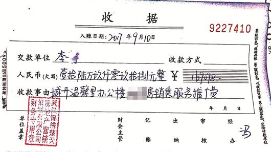 收據(jù)顯示,李女士所交的“推廣費(fèi)”是武漢錦繡楚天房地產(chǎn)營(yíng)銷(xiāo)策劃有限公司所收。記者聯(lián)系到該公司“陳總”,詢問(wèn)這筆錢(qián)該不該收。“你說(shuō)呢?”對(duì)方反問(wèn)記者,并說(shuō),“我很忙,不想多談,要想退錢(qián),可以去打官司。”