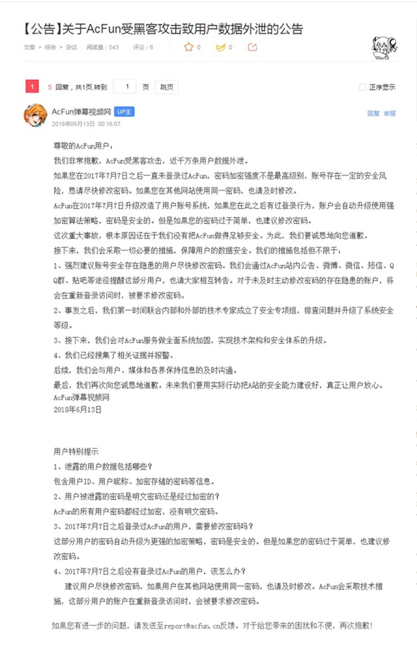 附:《關于AcFun受黑客攻擊致用戶數據外泄的公告》