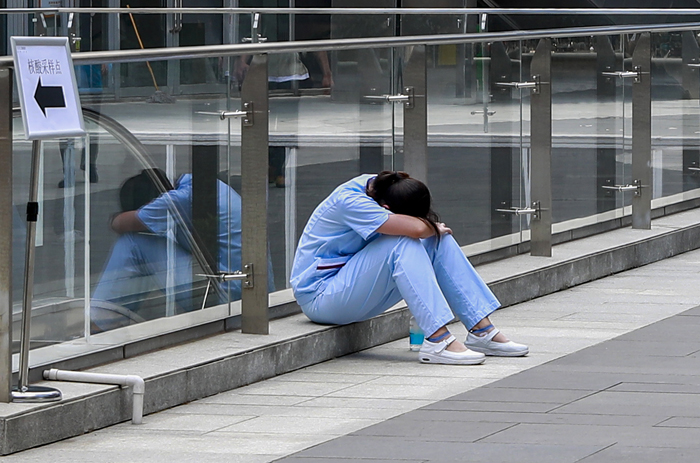 圖為:核酸采樣點旁,一名輪換下來的醫護人員正在休息 央廣網發 通訊員供圖