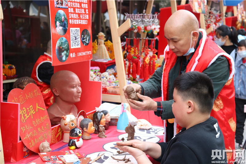 非遺市集添濃年味。主舞臺對面是由30余組花車組成的非遺市集。非遺市集格外紅火喜慶,精美的剪紙作品,憨態可掬的泥塑,漢繡、漢派石雕、魯班鎖、布藝堆繡、燈籠等工藝作品應有盡有,還有小朋友最愛的糖畫。