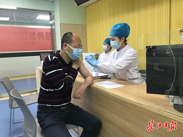 工作人員正在為居民接種疫苗。 長江日報見習記者張思敏攝