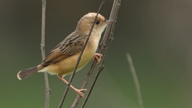 “其鳴唱為一個壓扁音接一個爆破音,非常有特點。”盧群說,隨后他循著叫聲細細尋找,在一片新生白茅草里發現了這只金頭扇尾鶯。他不僅抓拍下了一張照片,還拍下了一段金頭扇尾鶯站在灌木枯枝上鳴唱的視頻。