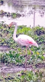 只見這只鳥體型很大,高約130厘米,羽毛偏粉色,嘴粉紅而端黑,嘴形似靴,頸甚長,腿長,紅色,兩翼偏紅。它時而在湖心單腿小憩,時而在淺水區(qū)漫步覓食,起飛時,如同低空一抹飄著的粉紅云朵。