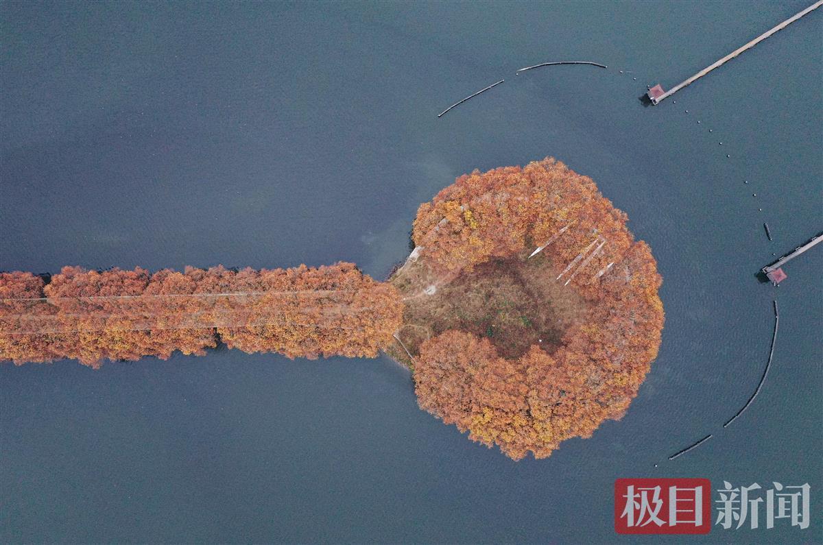 11月20日,極目新聞記者在武漢市東湖南山驛站附近看到,一條橙黃色的法國梧桐,仿佛一個驚嘆號伸入湖中,美不勝收。O目新聞記者 王永勝 攝)