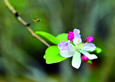 10月中旬,在解放公園二號門附近的桃樹林,一棵桃樹反季節綻放一朵紅色的桃花;在八匹馬雕塑附近的山坡,三棵櫻花樹和四棵海棠樹也反季節開花。