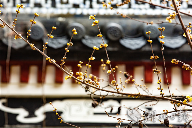 12月26日,在湖北秭歸屈原故里景區屈原祠內拍攝的蠟梅。寒冬時節,蠟梅盛放,花似蜜蠟,馨香肺腑,形成一道冬日溫情風景線。(視界網王罡攝)