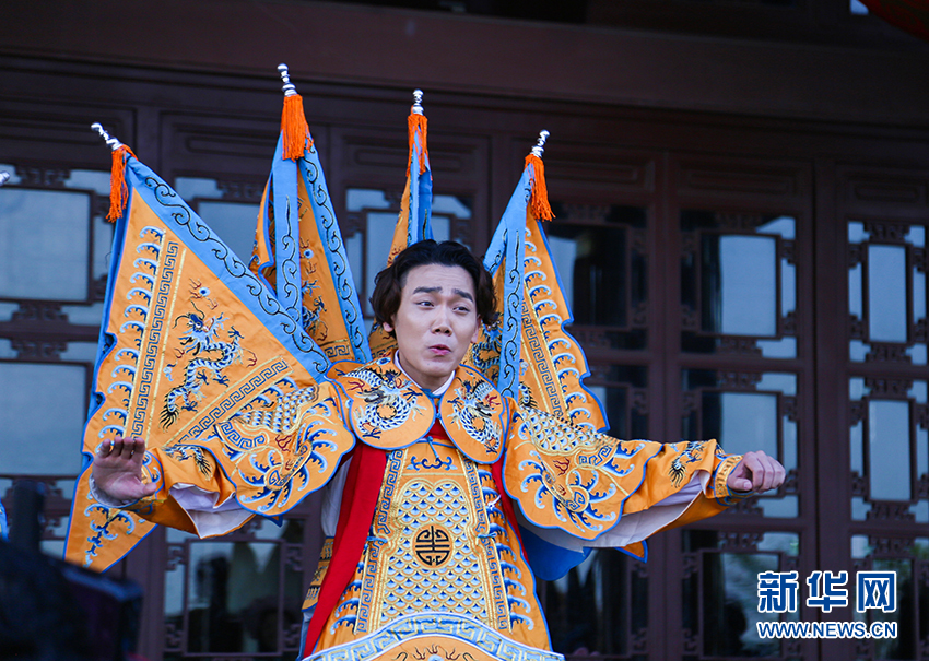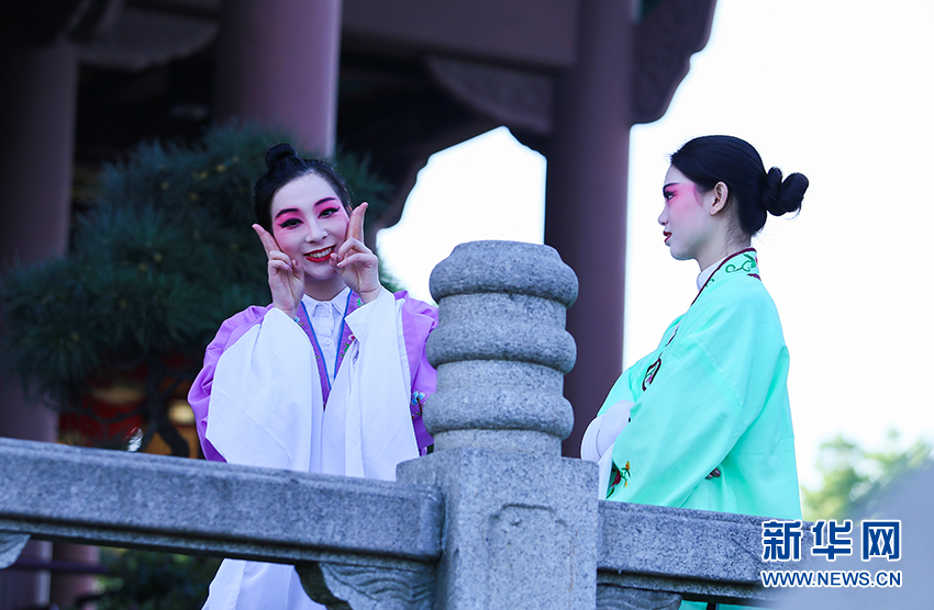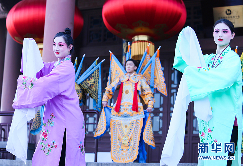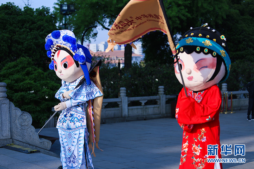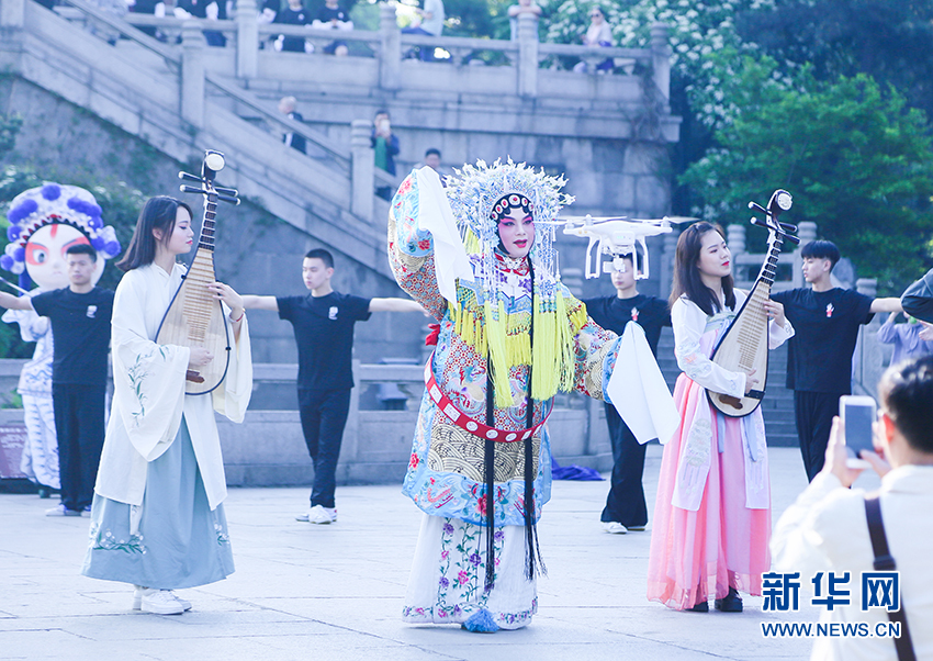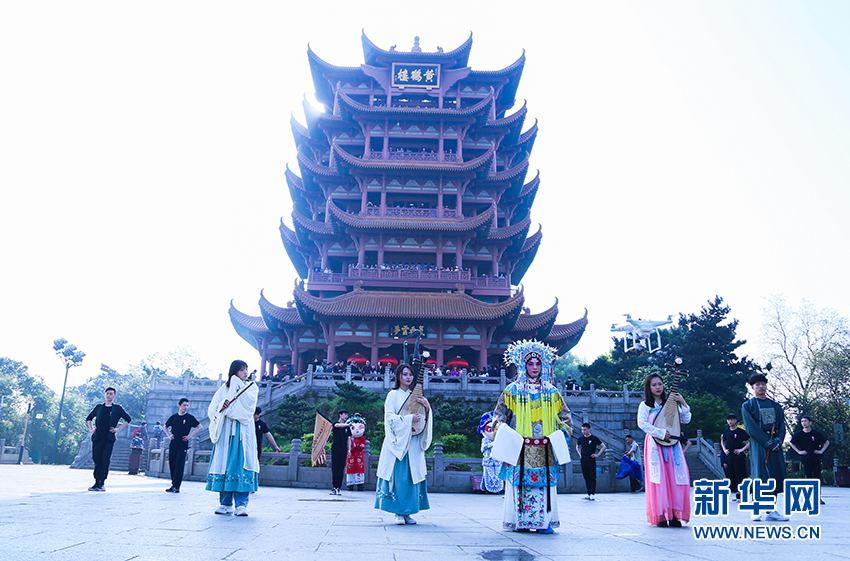 圖為7日在黃鶴樓下舉辦的戲曲快閃活動。新華網連迅 攝