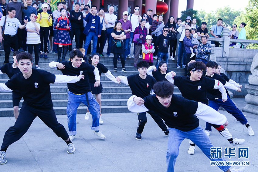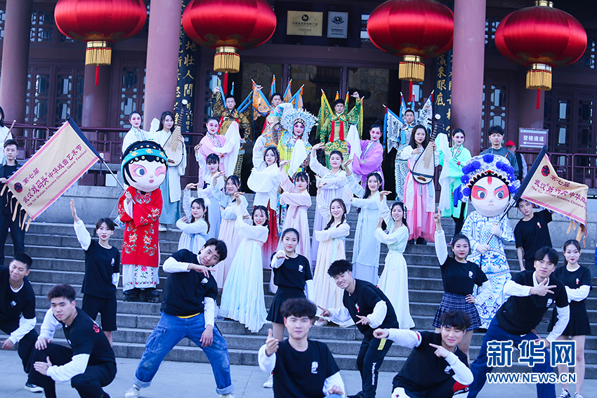 新華網武漢4月7日電(連迅)一場精彩的戲曲快閃活動7日在武漢黃鶴樓下舉行。當天來自中南財經政法大學、武漢音樂學院等高校的60多位戲曲愛好者不但表演了街舞等現代舞蹈,還身著戲服表演了傳統戲曲唱段《定軍山》《八板》(西皮)等。在國內四大名樓之一的黃鶴樓下,傳統文化與現代藝術相融合,吸引眾多游客駐足欣賞。