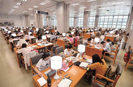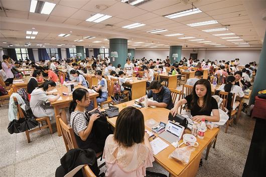 天氣炎熱,湖北省圖書館、武漢市圖書館內閱讀納涼的讀者爆棚,兩家圖書館日均涌入1萬多人。左圖為昨日清晨,讀者早早地在武漢市圖書館外排隊等待開門。楚天都市報記者徐穎蕭顥攝影報道
