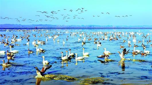 圖為:咸寧市咸安區(qū)斧頭湖水域,國家二級保護鳥類小天鵝等大批冬候鳥在此越冬。(湖北日報全媒記者 陳勇 攝)