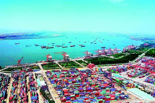 圖為:武漢港陽邏集裝箱碼頭集裝箱鐵水公聯(lián)運,實現(xiàn)江海直達,長江上千帆競發(fā)。(湖北日報全媒記者 梅濤 攝)