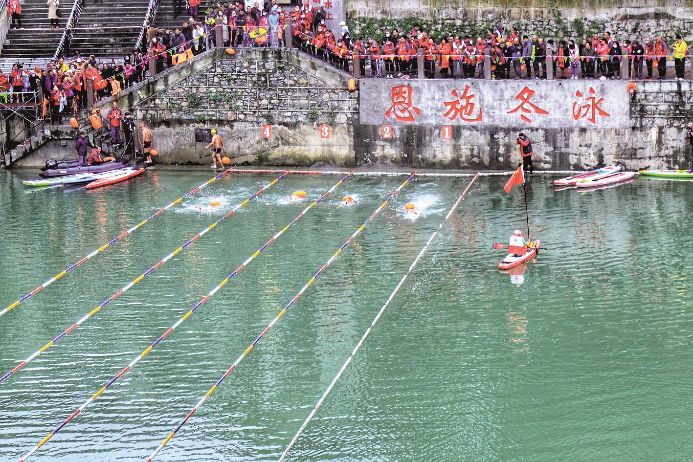 11月22日,游泳愛好者在恩施市城區(qū)清江河冬泳基地參加冬泳比賽。當(dāng)天,恩施州“百千萬”全民健身賽事活動——2020年冬泳邀請賽暨水上救援演練如期舉行,來自湖北、浙江、重慶、河南等全國各地的300余名游泳愛好者,迎著小雪節(jié)氣,搏擊清江,挑戰(zhàn)嚴(yán)寒,上演一場“速度與激情”大戲。