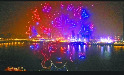 夜空中,千架無人機編隊組成“致敬巾幗、節(jié)日快樂”字樣。 記者許巍巍 攝