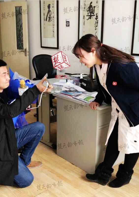 求婚的男子名叫馬楊晗,今年28歲,是荊門一家汽車4S店的員工。去年6月初,他到荊門市醫院求診,希望能祛斑美容。護士余敏接待了他,并耐心接受了馬楊晗的咨詢,此后,余敏的身影便深深印在了他的心底。