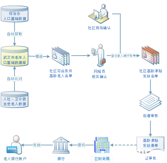 高齡津貼發(fā)放改革方面,從2018年1月1日起,武漢全市將依托養(yǎng)老服務(wù)信息平臺(tái)按季度發(fā)放高齡津貼。具體發(fā)放流程分為:第一步信息核查,武漢市養(yǎng)老服務(wù)信息平臺(tái)每季度末月將數(shù)據(jù)庫中的高齡老年人信息分配到社區(qū)(村),由網(wǎng)格員進(jìn)行核查;第二步審核確認(rèn),街道(鄉(xiāng)鎮(zhèn))核實(shí)確認(rèn)高齡津貼發(fā)放清單后,于每季度末月的20日前提交給區(qū)民政局(老齡辦)審核;最后是資金發(fā)放,區(qū)財(cái)政局根據(jù)區(qū)民政局(老齡辦)審核確認(rèn)的高齡津貼發(fā)放清單,將高齡津貼資金通過國(guó)庫集中支付到老人銀行賬戶上。