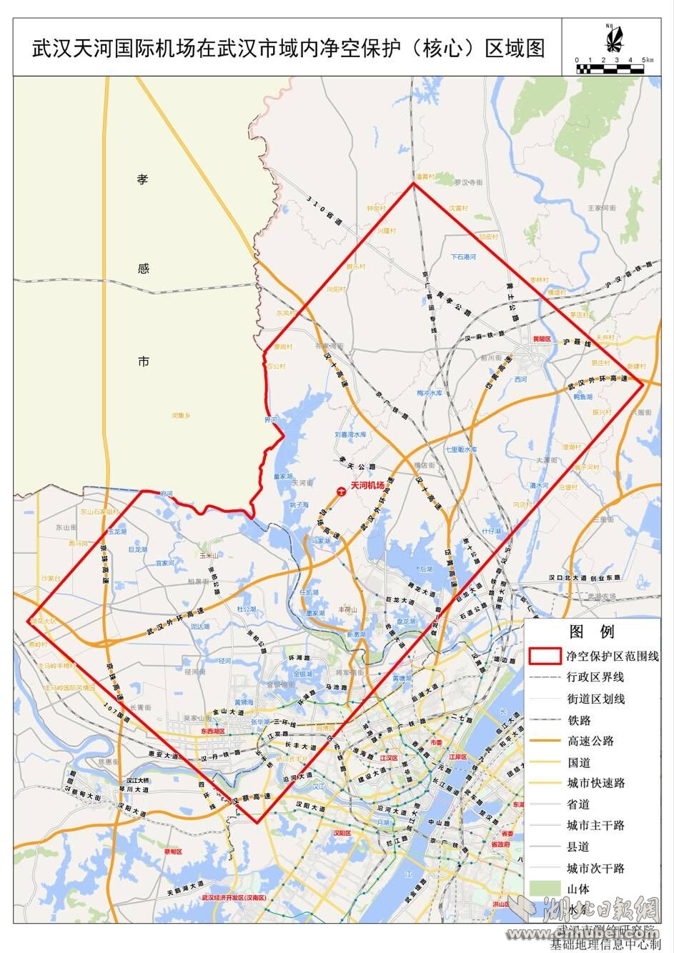 據規定,武漢天河國際機場跑道中心線兩側各10公里、跑道兩端各20公里以內的區域為機場凈空保護(核心)區域,總面積800平方公里。該區域包含黃陂區、東西湖區、硚口區、漢陽區的部分區域,另有涉及孝感市的部分區域將由湖北民航監管局協調孝感市進行管理。
