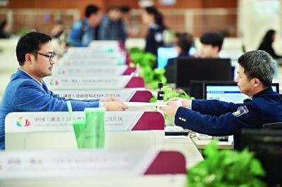中國(湖北)自由貿易試驗區武漢片區,企業在大廳辦理業務。記者任勇攝
