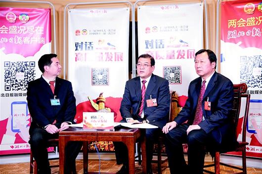 湖北日報訊 圖為:王遠鶴代表(右)、王立代表(中)接受湖北日報全媒記者楊宏斌訪談。(湖北日報全媒記者 柯皓 攝)
