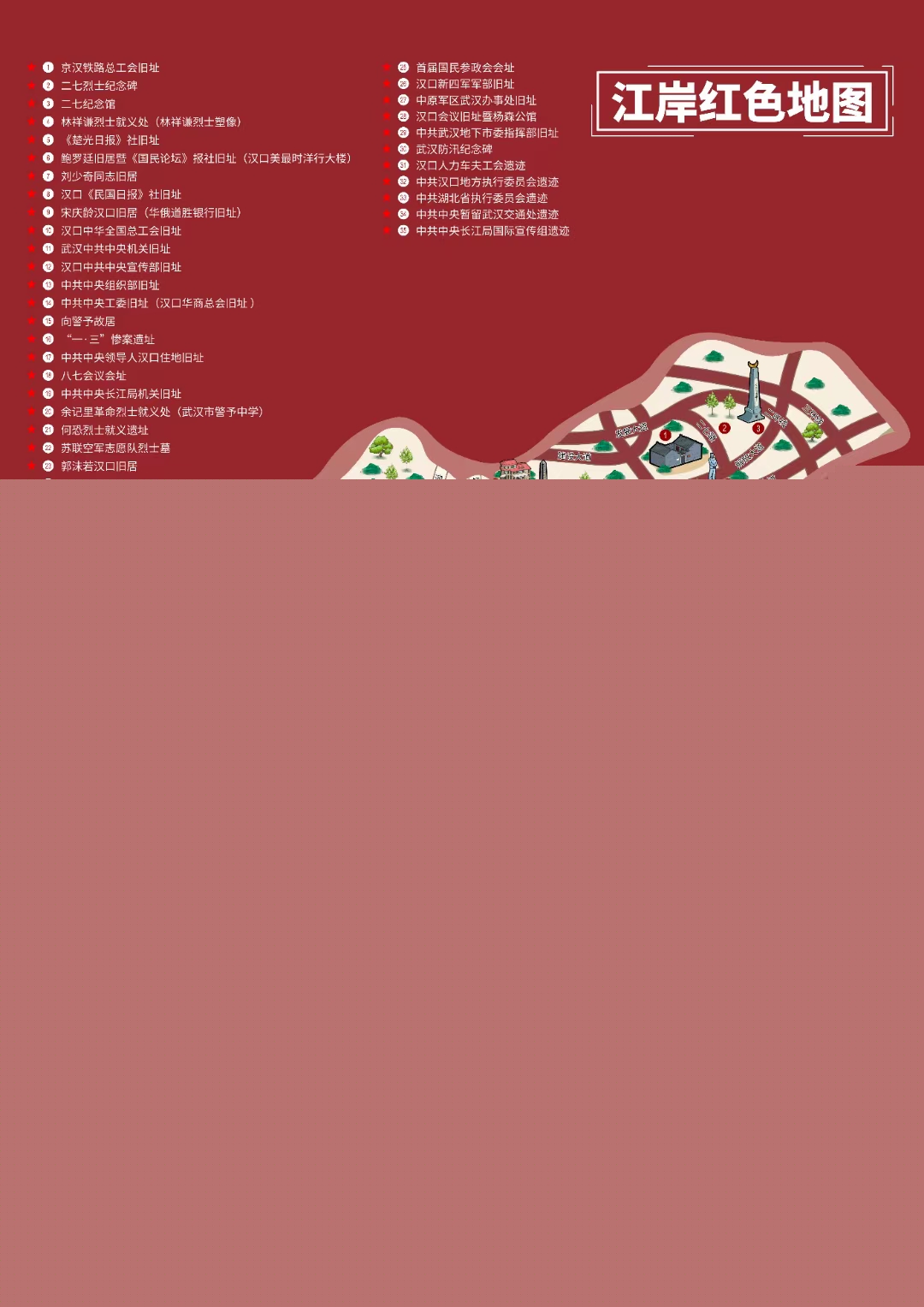 歷史是最好的教科書。該區將轄區內35處紅色點位進行梳理,經實地走訪、查閱史料、專家論證,繪制出《江岸紅色地圖》。這份地圖包含重要革命遺址遺跡、舊址及紀念設施,涵蓋了國家級、省級、市級文物保護單位。