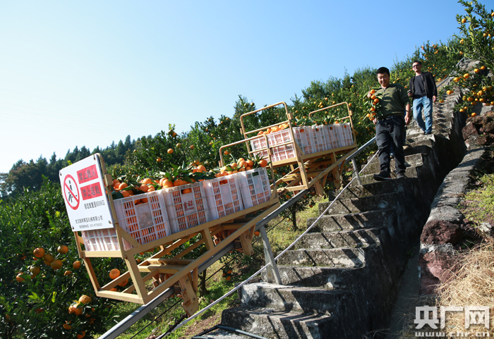 一箱箱新鮮的柑橘“乘坐”單軌運(yùn)輸機(jī),從橘園深處來(lái)到橘林外的通暢公路,打箱裝車,運(yùn)往縣城或集鎮(zhèn)的物流點(diǎn),運(yùn)往山外的大中城市。