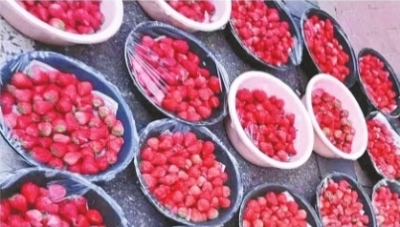 目前草莓大量上市,一盆盆擺路邊售賣。